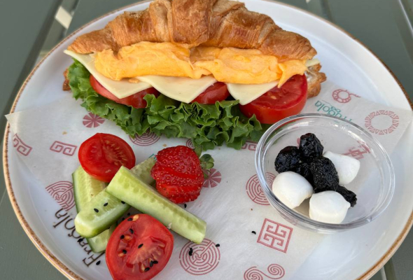 Tereyağlı kruvasan, omlet, 2 çeşit...